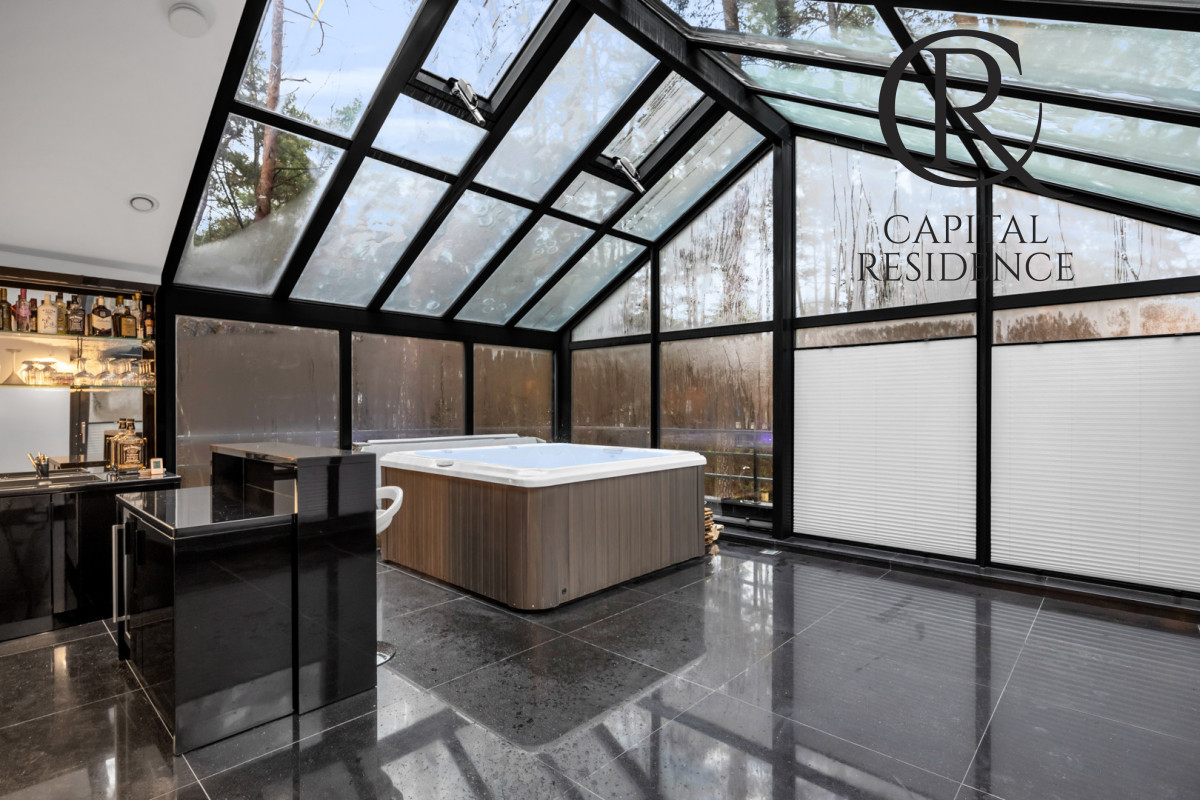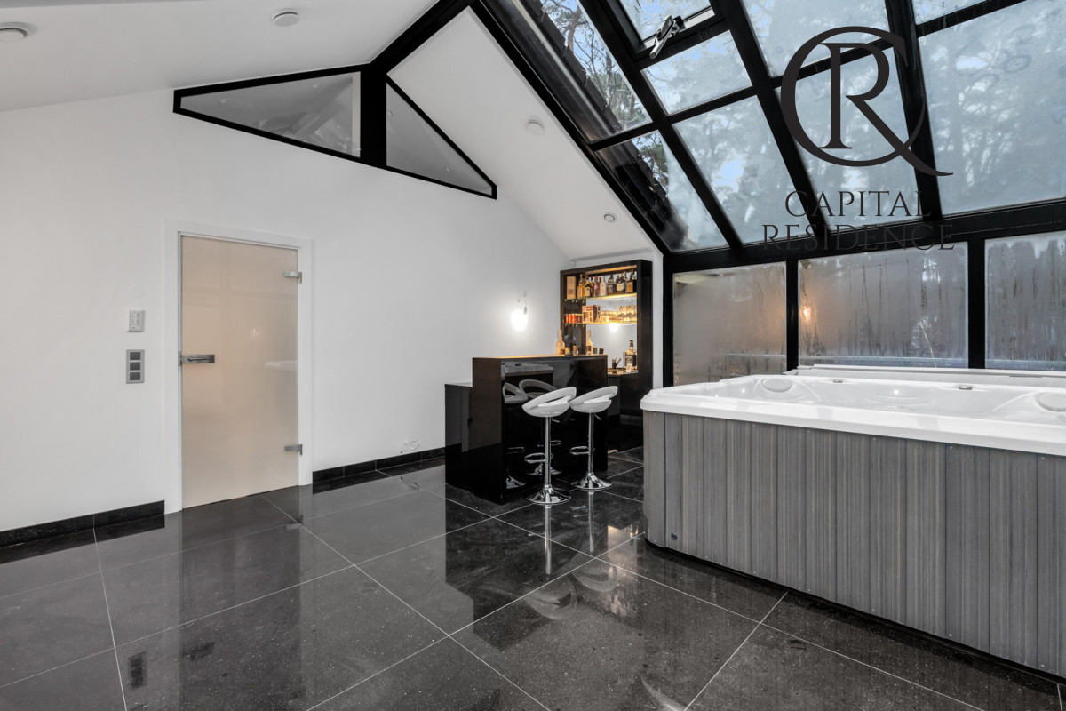 Strefa rekreacyjna: jacuzzi i bar z wyjściem na taras, zapewniające relaks na najwyższym poziomie.